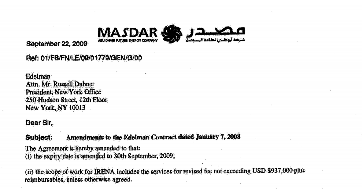 GMMB handled the marketing materials, which included promotional videos, a glossy pitch book, speeches, and presentations. When the date of the vote finally arrived and delegates arrived in Sharm el-Sheikh, Egypt, GMMB arranged for a video promoting Masdar City to be played in their hotel rooms. The UAE reportedly offered twice as much money to help run IRENA as its closest rival, Germany. Included in the UAE’s funding was a $1 million contract for Edelman to work with the agency, according to FARA filings. The UAE won the vote.