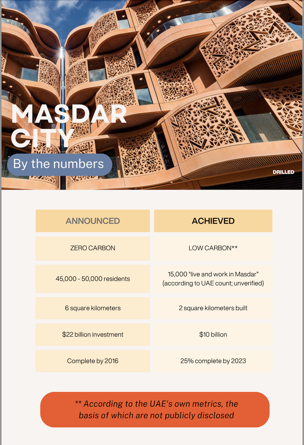 To date only about 2 of the planned 6 square kilometers of Masdar City have been built. Masdar’s chief operating officer has admitted that “the plug was more or less quietly pulled” on the idea of 6 square kilometers as early as 2008, after the financial crash — before Edelman and GMMB had even begun to promote Masdar City as “the world’s most ambitious sustainable development.” Less than half of the promised $22 billion investment has been spent.