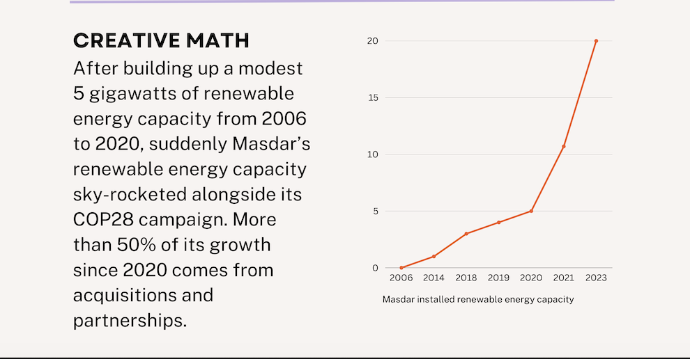 Masdar, on the other hand, made slow but steady progress. From 2006 to August 2020, the company was involved with projects delivering around 5 gigawatts of renewable energy capacity worldwide. As 2020 came to a close and the campaign to secure COP hosting rights began, that number suddenly doubled in press statements, although there were no project announcements that accounted for the sudden increase. In late 2022, in the months leading up to Al Jaber’s appointment as COP28 president, Masdar’s claimed renewable energy capacity doubled again, this time to more than 20 GW.