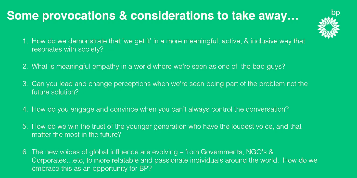 But there’s a silver lining in there and it’s this: the youth climate movement is really starting to get to these guys. BP clearly feels like it must at least try to do something to lower emissions. And yes that’s partly to do with the fact that it’s headquartered in a country that’s still signed on to the Paris Climate Agreement, but there’s nothing in this brief about that agreement or regulations or even the global energy market; there are five pages about the climate movement, and as many more about the need to get Gen Z to like them. Climate justice is mentioned, climate strikes, and the oil industry’s image as a “bad guy.”