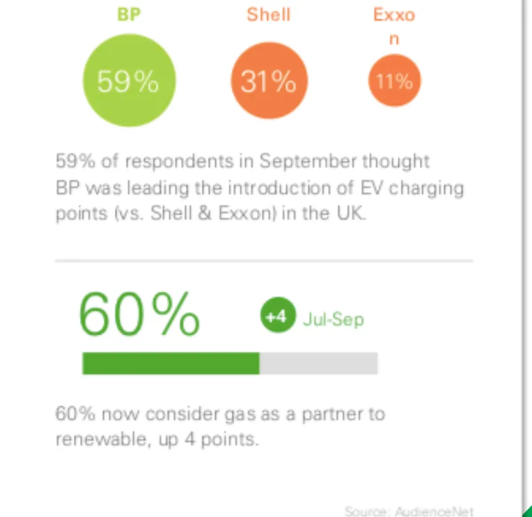 3. For BP, low-carbon includes natural gas, so the firm is deliberately trying to tie this fossil fuel to renewable energy. The fact that a full 60% of the public now associates natural gas with renewables — up four points! — is something that BP finds encouraging in its continued efforts to upgrade and burnish its reputation. (Folks, natural gas is a fossil fuel with intense greenhouse gas emissions.) Elsewhere in the deck, a graphic envisioning the company’s energy mix under a “transition to a lower carbon and digitally enabled future,” there is not a picture of a windmill or a solar panel, or even a nuclear plant, but of a natural gas refinery. It’s a neat trick: When your fuel of choice is methane, make everything about ‘net zero’ carbon emissions instead of actual zero emissions.