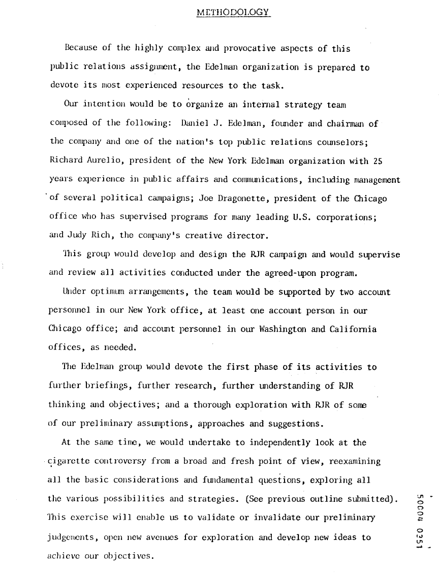 The R.J. Reynolds tobacco company approached Edelman in 1977 for a proposal to help restore its image and business, in the wake of the 1971 ban on cigarette advertising.