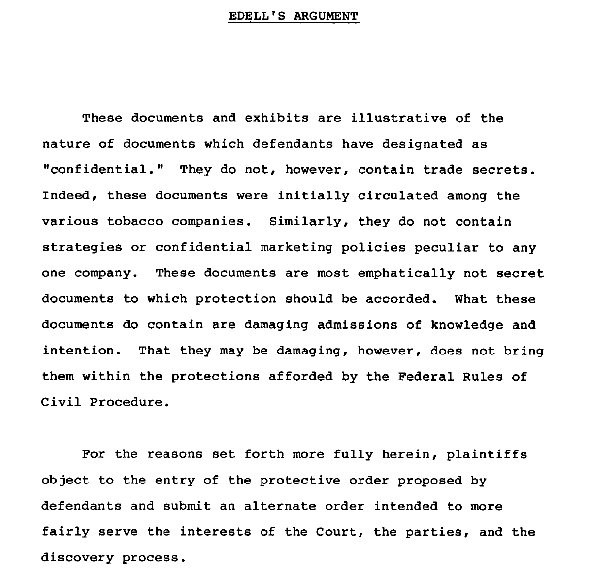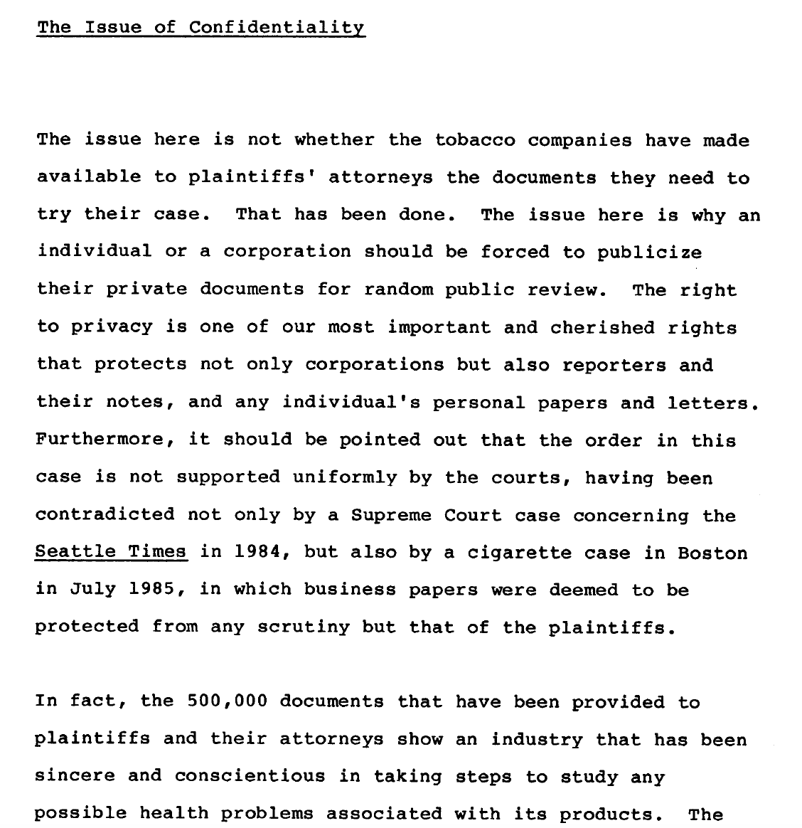 The proposal was a success—Edelman was still advising R.J. Reynolds in 1985, per documents in the Industry Archive at UCSF. In the document highlighted below, for example, an Edelman exec on the account is advising RJR how to handle the hundreds of internal industry documents that had, by that point, become public.