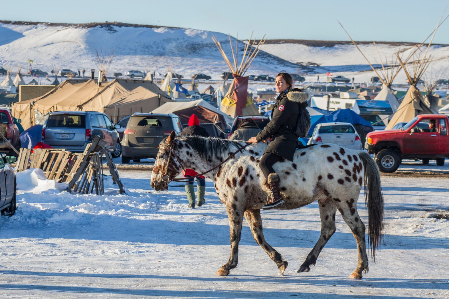 A water protector at Standing Rock in the winter of 2016. Photo credit: Dark Sevier