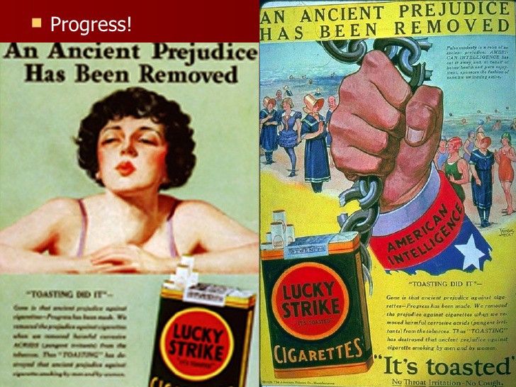 In 1929, the head of the American Tobacco Company called Bernays up and said "we're losing half of our potential market—there's a taboo against women smoking, what can we do to break down that taboo?" Bernays asked if he could go talk to a psychoanalyst about it and got the green light. Through that conversation he came up with the idea of cigarettes being associated with female empowerment (and, yes, penis envy). So he called up a few stylish and influential young women he knew, asked them if they would be interested in staging a little protest, walking up and down 5th avenue smoking, and they agreed. Once he knew the "protest" was on, Bernays notified all the newspapers and magazines. His "Torches of Freedom" protest spread like wildfire and within a year the taboo on women smoking had been permanently lifted.