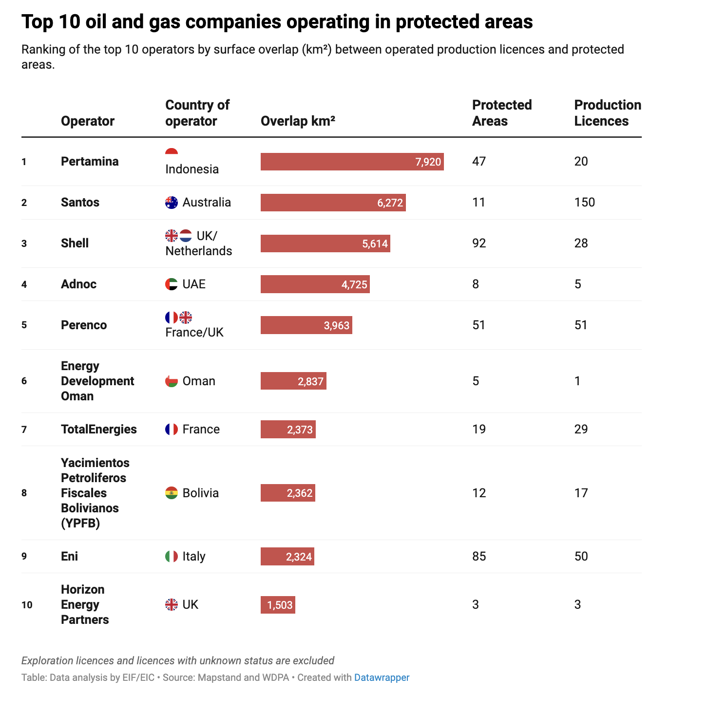 Several companies in our top 10 including Perenco, Energy Development Oman and the Emirati company Adnoc do not enforce any “no-go” policy. In their annual reports, Shell, TotalEnergies, and ENI only commit to not operate in UNESCO sites, and therefore allow themselves to drill in all other protected areas.