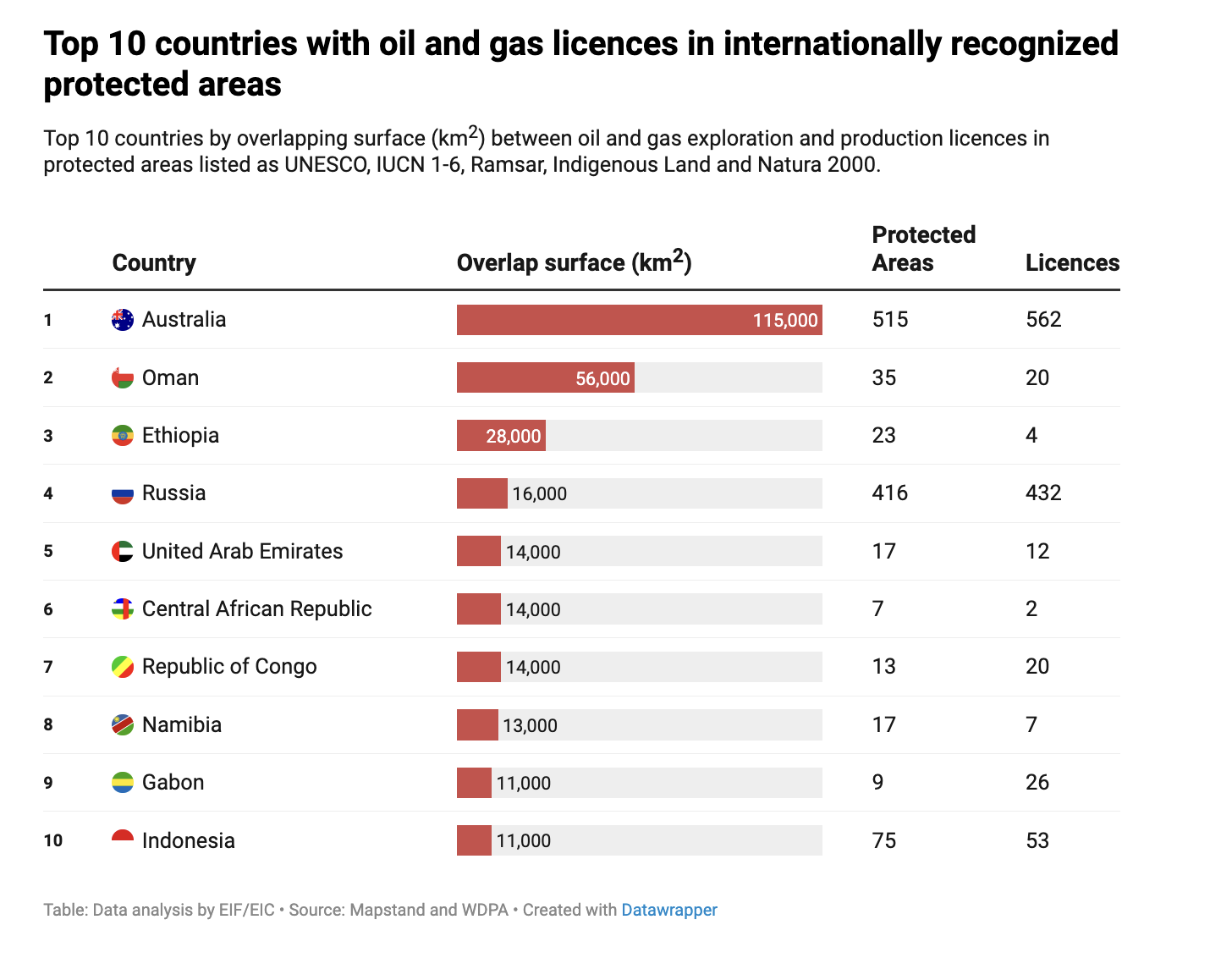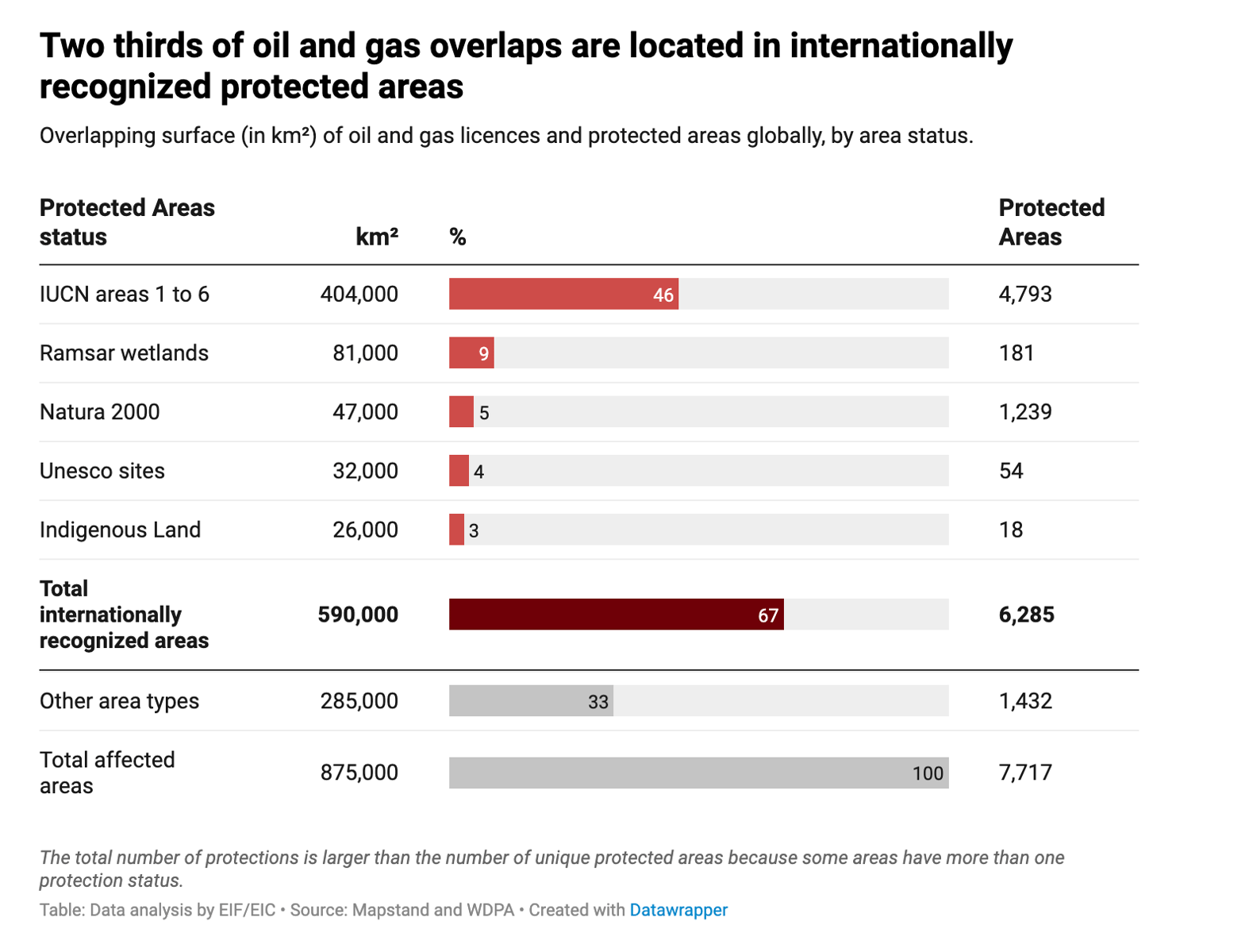 Only a small part of these 690,000 km² overlapping with protected areas are actually covered by oil and gas facilities on the ground. But all these encroachments represent an actual or potential threat to biodiversity. Leave it in the Ground (LINGO), an NGO which has published numerous reports on the subject called for “an immediate ban on fossil fuel exploration and extraction in protected and conserved areas globally”.