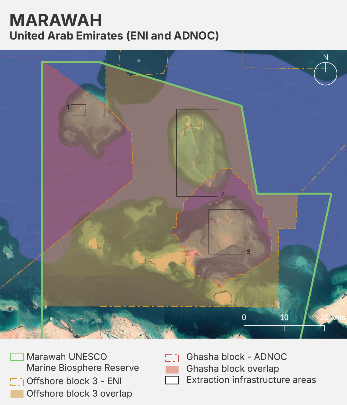 TotalEnergies also holds shares in a LNG plant in the Great Barrier Reef while ENI has an exploration license located inside a UNESCO Biosphere Reserve: the Marawah Marine Protected Area in the United Arab Emirates, which covers 4,249 km². This archipelago of a dozen islands, surrounded by coral reefs and dotted with mangrove forests is home to the world's second-largest colony of dugongs, an endangered marine mammal. Commercial gas extraction has not yet begun, but exploration for new wells is already well underway and ENI announced the discovery of a significant deposit in 2022.