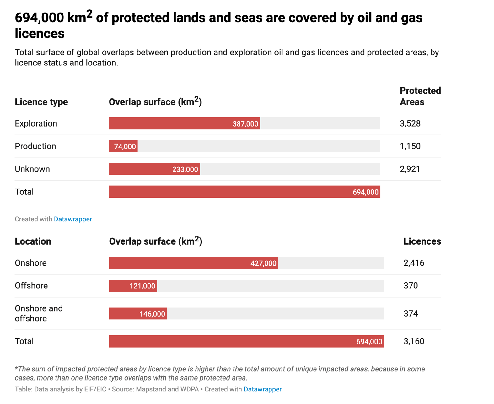 Then come the permits whose status is not available in our data. And finally, the overlaps of oil and gas production licenses, the ones creating the biggest risk, are still almost as big as Ireland, covering 74,000 km² of protected areas.