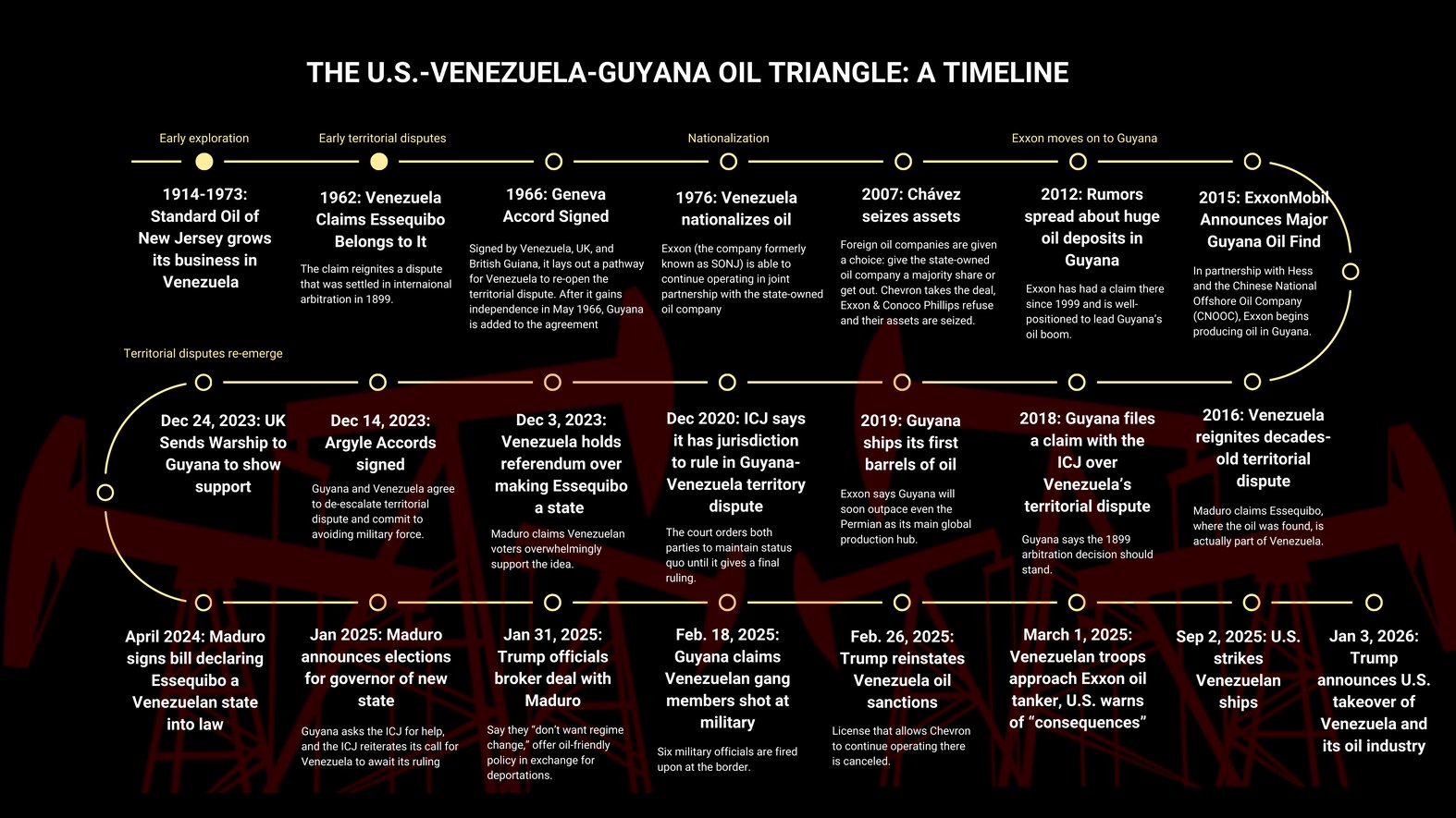 When U.S. President Donald Trump first ordered strikes on Venezuelan ships in September, it was purportedly to intercept drug traffickers. Three months later everyone, including the president himself, acknowledges the role Venezuela’s oil and its fraught relationship with U.S. oil companies over the years plays in the United States’ invasion of the country. But Drilled reporting shows that U.S. oil majors don’t necessarily want back into Venezuela’s declining and decrepit oil fields so much as they are eager to protect their interests in neighboring Guyana, home to one of the world’s most productive oil fields, which Venezuelan president Nicolás Maduro has aggressively been trying to claim as his own over the past decade.