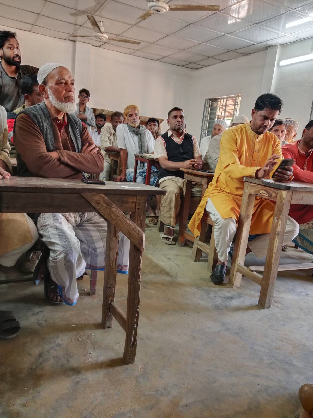 (Above) Power lines from the Matarbari power plant running across the Kohelia river. (Right) People of Moheshkhali gathered at a Madrassa (an Islamic school) raising concerns about land acquisition for the mega project. Photos by: Rishika Pardikar
