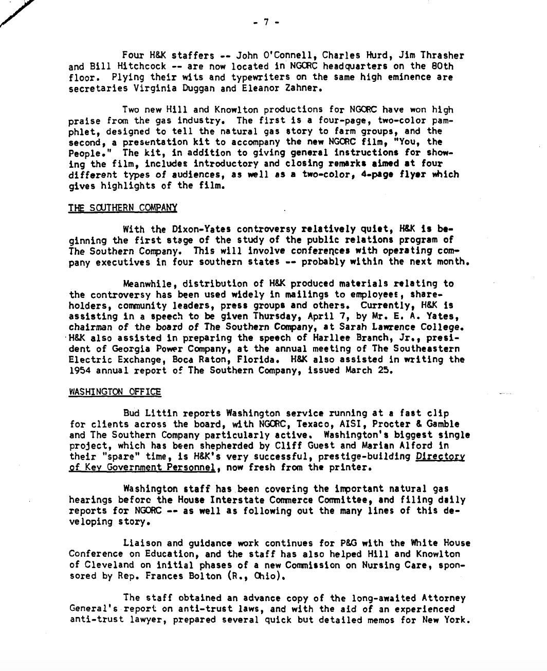 That meant working in Washington, too, of course. Shortly after the war, Hill and Knowlton became the first PR firm to have staff dedicated to public policy work. The Washington office didn’t have its own accounts; it existed solely to handle government relations for the firm’s New York and Cleveland clients. By this point that meant they had their hands in everything from energy policy to agriculture and all points between, for clients like Texaco, Marathon Oil, Coca Cola, Monsanto, and a big new client: the Tobacco Industry Research Committee.
