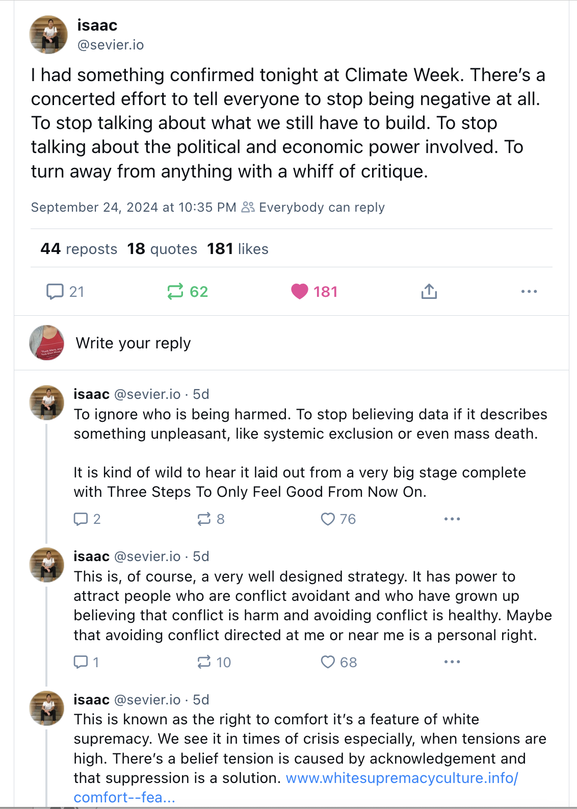 This insistence that everything is normal and fine when it is so clearly not is something of a hallmark of the climate movement in my experience, particularly amongst those with power and money. It’s also a hallmark of white supremacy, as Isaac Sevier pointed out on BlueSky: