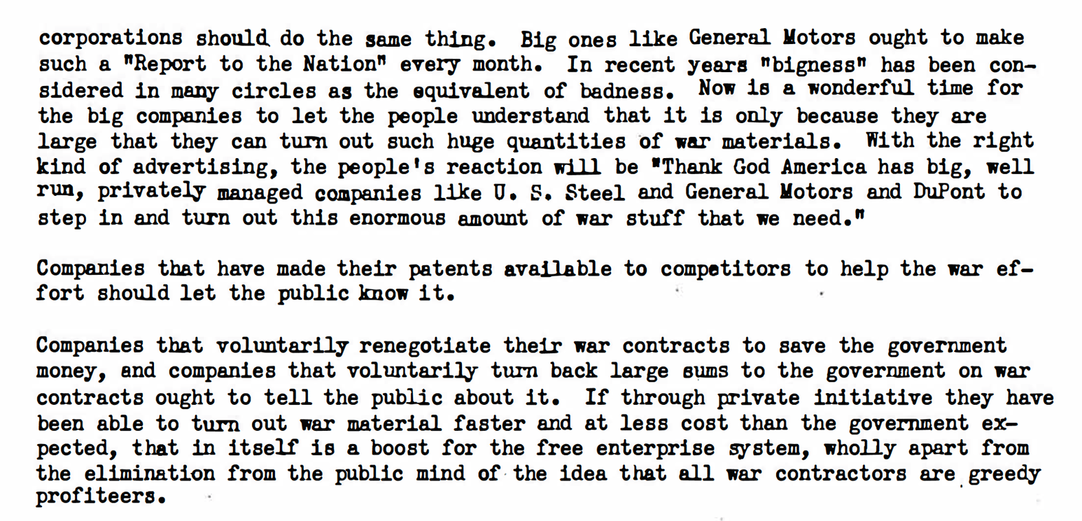 In recent years "bigness" has been considered in many circles as the equivalent of badness. Now is a wonderful time for the big companies to let the people understand that it is only because they are large that they can turn out such huge quantities of war materials. With the right kind of advertising, the people's reaction will be •Thank God America has big, well run, privately managed companies like U.S. Steel and General Motors and DuPont to step in and turn out this enormous amount of war stuff that we need."