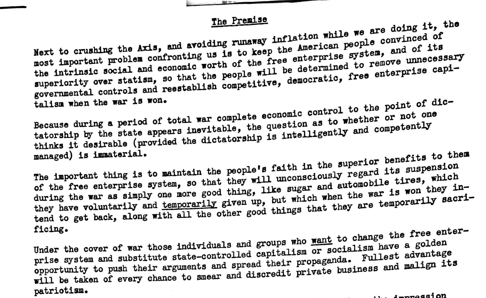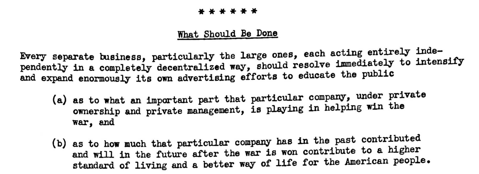 Internally, in the wake of WWII, we know from the notes and strategies of various PR gurus at the time that fossil fuel companies, and American industry more broadly, were panicking about how comfortable the American public had gotten with government involvement in business. In this “all hands on deck” strategy that Earl Newsom prepared for his clients, Standard Oil of New Jersey (today Exxon), Ford, GM, and Procter & Gamble, for example, he wrote: