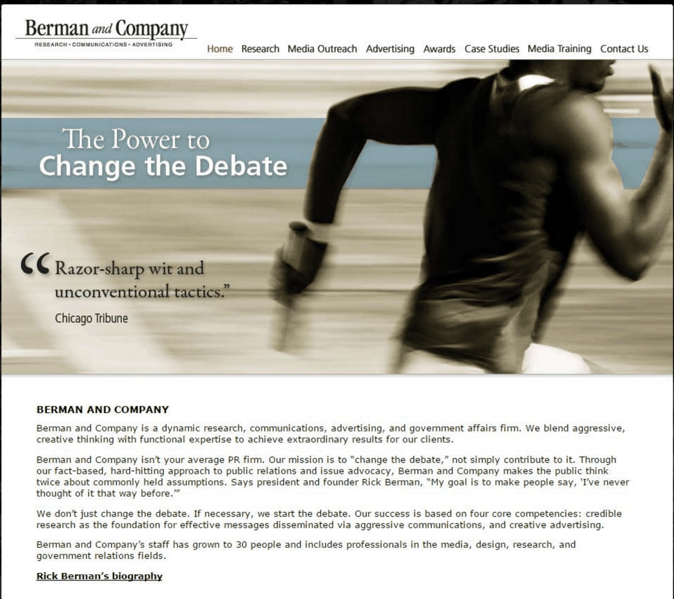 In 1987, Rick Berman founded Berman and Company, a full-service research and communications firm, with seed funding from its anchor client, Philip Morris. Prior to that Berman was employed as an Executive Vice President for Pillsbury, labor attorney for Bethlehem Steel and The Dana Corporation, as well as Director of Labor Law for the U.S. Chamber of Commerce. In 2007, a 60 Minutes special on Berman dubbed him "Dr. Evil," a nickname that's stuck over the years.