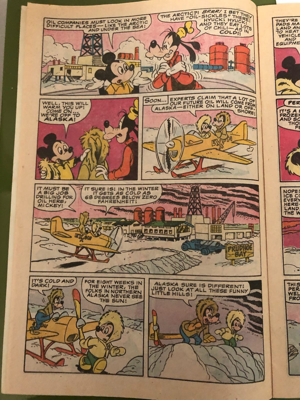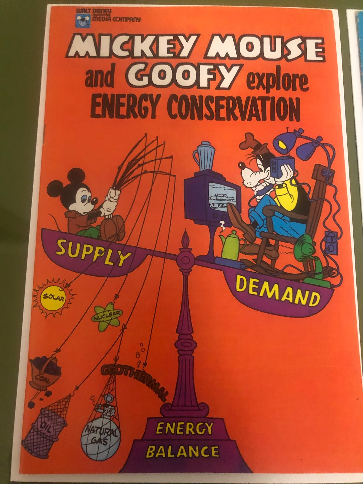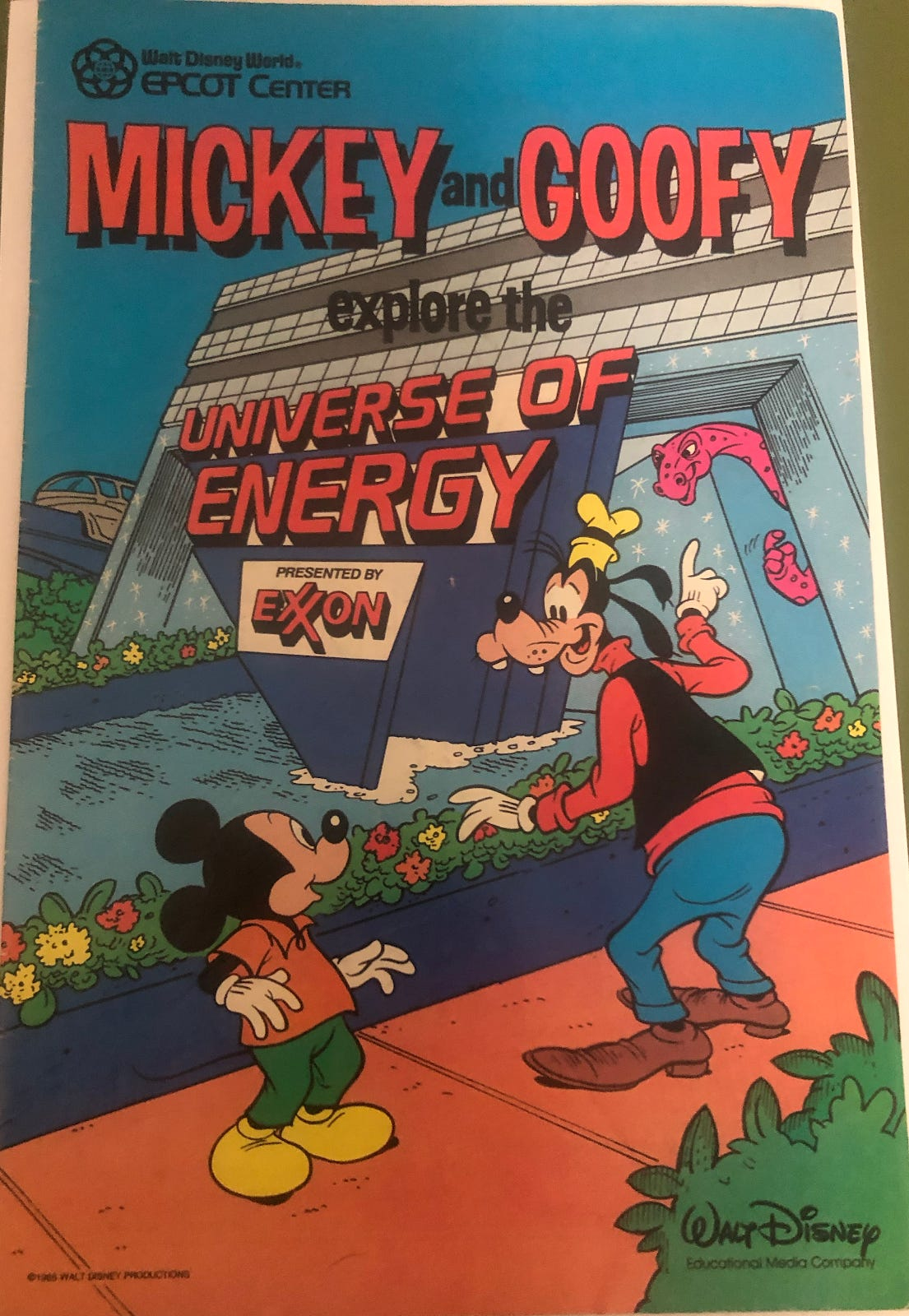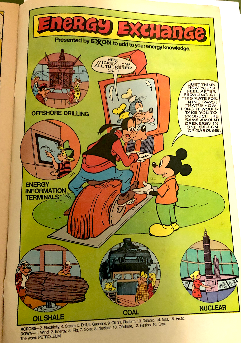 The photos below are from a comic book that Disney put out in conjunction with Exxon in the 1980s, at the same time that Exxon was sponsoring the Universe of Energy Center at Epcot. Both were aimed at shaping kids’ understanding of energy and the economy.