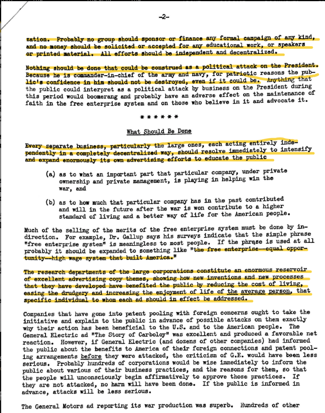 Earl Newsom worked for Standard Oil of New Jersey, which eventually became Exxon, from the early 1940s til he retired in the mid-1960s. He managed every aspect of the company's public persona, from seemingly inconsequential decisions like whether or not a VP should accept an award from a PR college for his work on education (Newsom said no, lest people think Standard's investments in universities were just a PR stunt) to the company's approach to developing oil fields in South America and the Middle East to cross-industry strategies for shaping how Americans think about the economy. One of the most fascinating documents Newsom left behind was a strategy document from early in the year in 1945. WWII was coming to a close, and Newsom was concerned—not that the Allies would lose, or that the companies he worked for would have to find new revenue streams once wartime purchasing ended, but that Americans had grown so used to the government taking care of them that they might turn away from the benefits of free enterprise. At the time, Newsom was working for Standard Oil of New Jersey, Ford, and GM, but the plan included non-clients too, it was an all-hands-on-deck moment for industry.