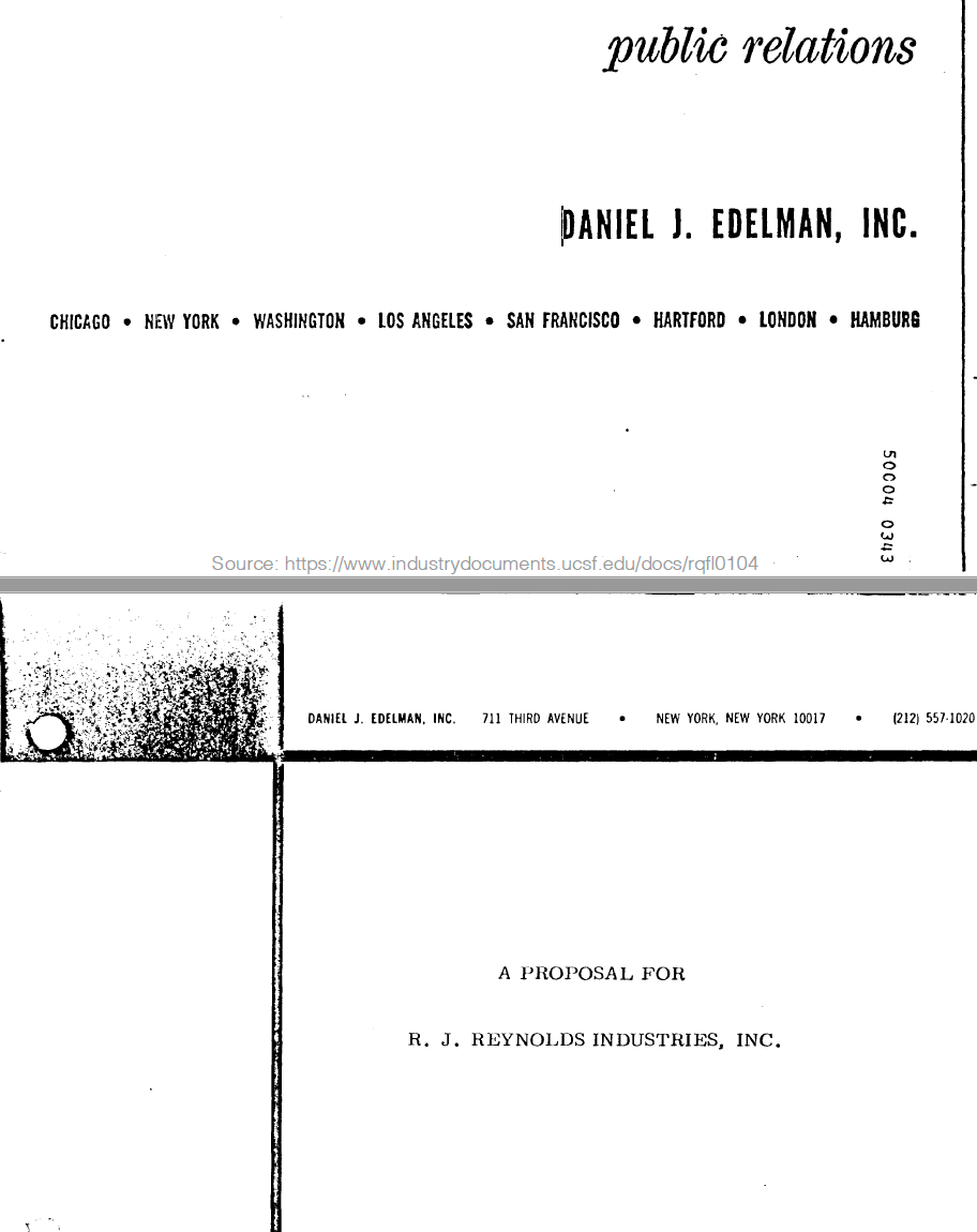 The R.J. Reynolds tobacco company approached Edelman in 1977 for a proposal to help restore its image and business, in the wake of the 1971 ban on cigarette advertising.