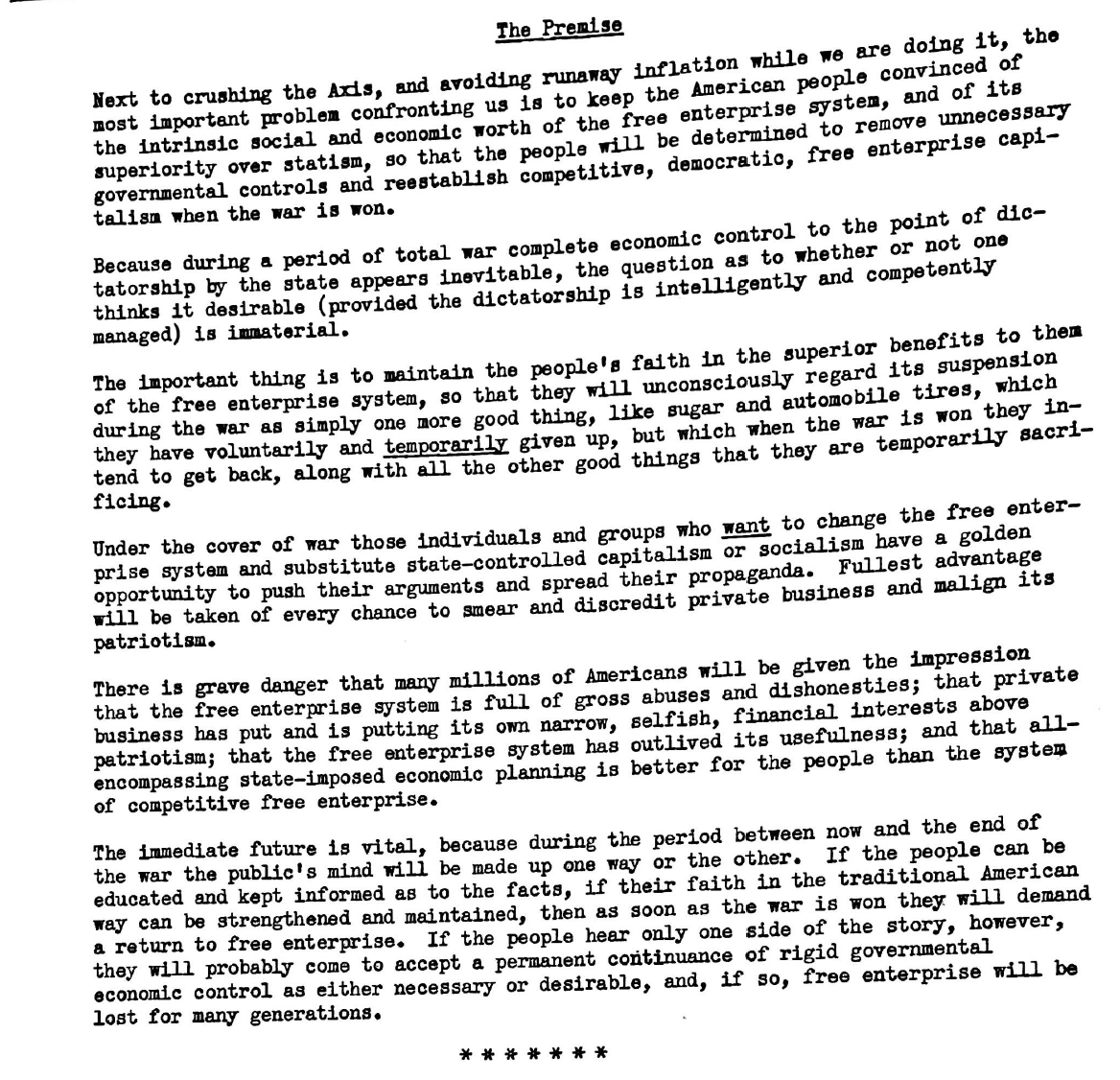 "Next to crushing the Axis, and avoiding runaway inflation while we are doing it, the most important problem confronting us is to keep the American people convinced of the intrinsic social and economic worth of the free enterprise system," he wrote. "And of its superiority over statism, so that the people will be determined to remove unnecessary governmental controls and reestablish competitive, democratic, free enterprise capitalism when the war is won.”