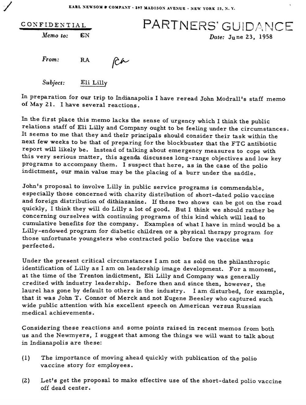 Newsom was one of the first publicists to work with the pharmaceutical industry, advising Eli Lilly for years, with a focus on pushing the idea that private enterprise and pharma profits were the key to innovation and life-saving miracles. Newsom and Lilly's other PR firm, Hill & Knowlton, would coordinate various campaigns and press pushes through the pharma trade group, the Pharmaceutical Manufacturers Association.